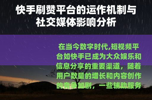 在当今数字时代,短视频平台如快手已成为大众娱乐和信息分享的重要渠道,随着用户数量的增长和内容创作的竞争加剧,一些辅助服务应运而生,其中刷赞平台逐渐受到关注,这类平台主要提供点赞数增长服务,帮助内容创作者在短时间内提升视频的互动数据,本文将从多个角度探讨快手刷赞平台的相关情况,分析其运作机制,并讨论其对社交媒体生态的潜在作用。