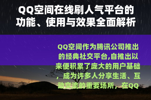 QQ空间作为腾讯公司推出的经典社交平台,自推出以来便积累了庞大的用户基础,成为许多人分享生活、互动交流的重要场所,在QQ空间中,人气指数——包括访问量、点赞数、评论量等——常常被视为用户受欢迎程度和社交影响力的体现,不少用户寻求快速提升人气的方法,以增强个人或商业内容的曝光度,在这样的背景下,QQ空间在线刷人气平台逐渐进入公众视野,为用户提供了一种便捷的提升人气工具,本文将详细介绍这些平台的功能、运作方式、使用场景以及相关考量,帮助读者全面了解这一现象。