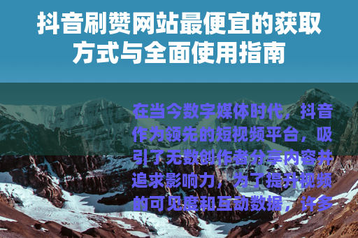 在当今数字媒体时代,抖音作为领先的短视频平台,吸引了无数创作者分享内容并追求影响力,为了提升视频的可见度和互动数据,许多用户转向刷赞网站寻求快速增加点赞数的方法,本文将围绕“抖音刷赞网站最便宜”这一主题,介绍如何获取性价比高的服务,并提供详细的使用建议,帮助用户在预算内实现目标,同时确保操作的安全与有效。