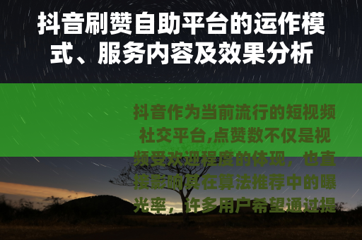 抖音作为当前流行的短视频社交平台,点赞数不仅是视频受欢迎程度的体现,也直接影响其在算法推荐中的曝光率,许多用户希望通过提升点赞数来增强视频的互动性和可见度,因此抖音刷赞自助平台逐渐成为了一种常见的辅助工具,这类平台允许用户通过自主操作,快速为指定视频增加点赞数量,以满足个人或商业需求。