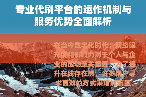 在当今数字化时代,网络曝光度和影响力对于个人与企业的成功至关重要,为了提升在线存在感,许多用户寻求高效的方式来增加流量、粉丝或互动,专业代刷平台应运而生,为用户提供了一系列定制化服务,帮助他们在竞争激烈的网络环境中脱颖而出,这类平台通过系统化的方法和资源整合,旨在实现用户目标的快速达成,同时确保过程的稳定性和效果的可衡量性。