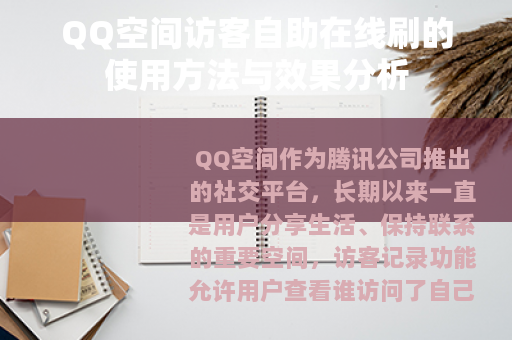 QQ空间作为腾讯公司推出的社交平台,长期以来一直是用户分享生活、保持联系的重要空间,访客记录功能允许用户查看谁访问了自己的个人主页,这不仅增强了互动性,还提升了社交体验,随着网络社交的普及,许多用户希望提升自己空间的访客数量,以增加人气和关注度,为此,QQ空间访客自助在线刷服务逐渐进入公众视野,为用户提供了一种便捷的解决方案。