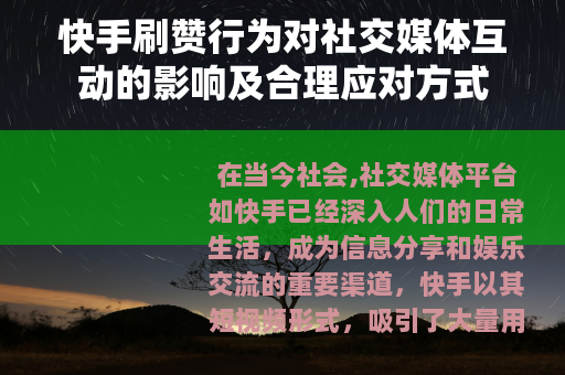 快手刷赞是一个涉及技术、心理和社会因素的现象,通过平台技术的改进、用户行为的调整以及社会教育的加强,可以减轻其潜在影响,我们应认识到,在社交媒体中,真实的数据和互动才能带来长久的价值,希望本文的分析能为读者提供参考,帮助大家在快手等平台上实现更有意义的参与和成长,通过共同努力,我们可以营造一个更健康、更富有创造力的网络社区,让点赞成为真实认可的表达,而非数字游戏的工具。