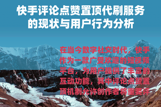 在当今数字社交时代,快手作为一款广受欢迎的短视频平台,为用户提供了丰富的互动功能,其中评论点赞置顶机制允许创作者将重要评论展示在突出位置,以增强内容的参与度和可见性,随着平台用户规模的扩大和竞争加剧,一种称为“代刷”的服务逐渐进入公众视野,即通过第三方协助用户快速获得评论点赞并实现置顶,这一现象不仅反映了用户对互动数据的追求,也引发了关于社交媒体生态的广泛讨论,本文将从服务模式、用户动机、市场现状及平台影响等方面,系统分析快手评论点赞置顶代刷的相关情况。