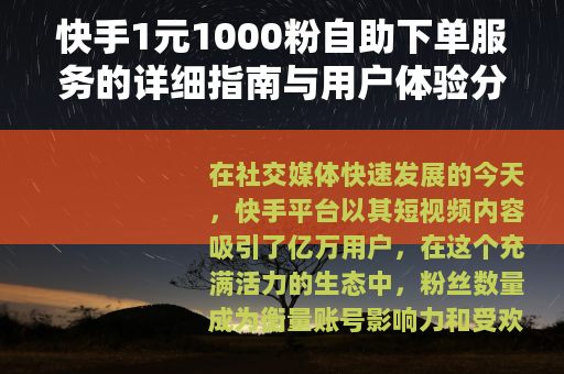 在社交媒体快速发展的今天,快手平台以其短视频内容吸引了亿万用户,在这个充满活力的生态中,粉丝数量成为衡量账号影响力和受欢迎程度的重要指标,许多用户希望通过增加粉丝来提升账号的可见度,而“快手1元1000粉自助下单”服务作为一种增粉方式,逐渐进入大众视野,这项服务以低廉的价格和自助操作的特点,为用户提供了一条快速积累粉丝的途径,本文将详细介绍这项服务的使用方法、优势以及相关注意事项,帮助用户更好地理解和应用。