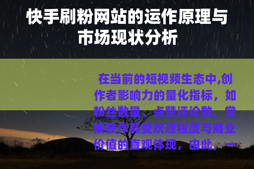在当前的短视频生态中,创作者影响力的量化指标,如粉丝数量、点赞评论数,常被视作其受欢迎程度与商业价值的直观体现,由此,一种旨在快速提升这些数据指标的服务——通常被称为“快手刷粉网站”——在市场需求下应运而生,这类网站通常作为一个第三方服务平台,为有需求的用户提供增粉、增赞、增评论等数据提升服务。
