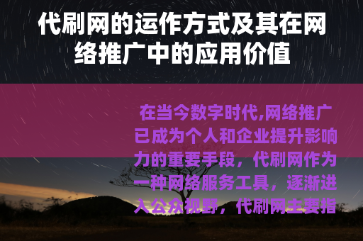 代刷网作为网络工具,在特定场景下具有应用价值,它的运作方式基于技术手段,服务于网络推广的多样化需求,通过理解代刷网的服务类型和应用方法,用户可以在数字时代更好地应对挑战,提升网络存在感,随着互联网环境的不断变化,代刷网的角色也将持续演进,为个人和企业提供更多可能性。
