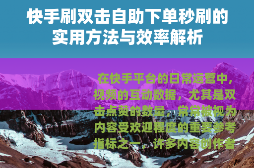 在快手平台的日常运营中,视频的互动数据,尤其是双击点赞的数量,常常被视为内容受欢迎程度的重要参考指标之一,许多内容创作者希望提升视频的互动表现,寻找安全且有效率的方法来辅助运营,成为他们关注的焦点,自助下单服务因其便捷性和即时性,受到部分用户的关注,本文将围绕这一主题,介绍相关的操作方法、技术原理以及在实际应用中的注意事项。