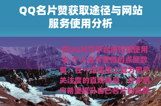 旨在提升QQ名片赞数量的网站服务,是网络社交生态衍生出的一种需求反馈,它为有快速提升数据指标需求的用户提供了一种技术化的解决方案,在理解其运作原理的基础上,用户可以根据自身情况决定是否使用。