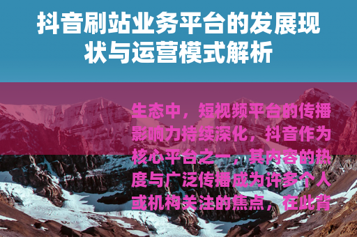 生态中,短视频平台的传播影响力持续深化,抖音作为核心平台之一,其内容的热度与广泛传播成为许多个人或机构关注的焦点,在此背景下,衍生出了一种特定的网络服务类型,通常被称作“抖音刷站业务平台”,这类平台主要围绕抖音的内容数据互动提供一系列技术性服务。
