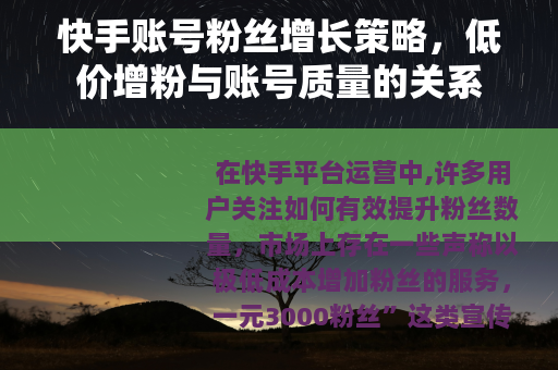在快手平台运营中,许多用户关注如何有效提升粉丝数量,市场上存在一些声称以极低成本增加粉丝的服务,一元3000粉丝”这类宣传,理解这类服务背后的逻辑及其对账号的长期影响,对于创作者来说具有重要意义。