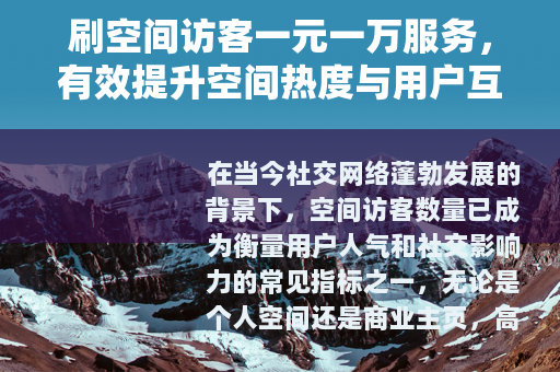 在当今社交网络蓬勃发展的背景下,空间访客数量已成为衡量用户人气和社交影响力的常见指标之一,无论是个人空间还是商业主页,高访客数往往能带来更多关注和互动机会,从而增强用户的网络存在感,为了满足这一需求,市场上出现了多种刷空间访客的服务,刷空间访客一元一万”以其价格低廉和效果显著的特点,吸引了广泛注意,本文将系统介绍这一服务的运作方式、应用场景以及相关使用建议,旨在为读者提供全面的参考信息。