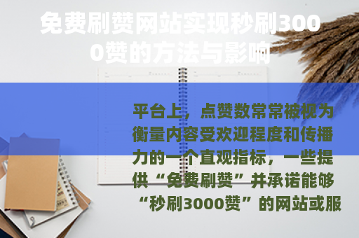 平台上,点赞数常常被视为衡量内容受欢迎程度和传播力的一个直观指标,一些提供“免费刷赞”并承诺能够“秒刷3000赞”的网站或服务应运而生,吸引了不少内容创作者或运营者的目光,这类服务通常宣称能在极短时间内,以零成本大幅提升指定内容的点赞数量,本文将围绕这一现象,分析其运作方式、可能带来的后果,并探讨更为可持续的互动提升策略。