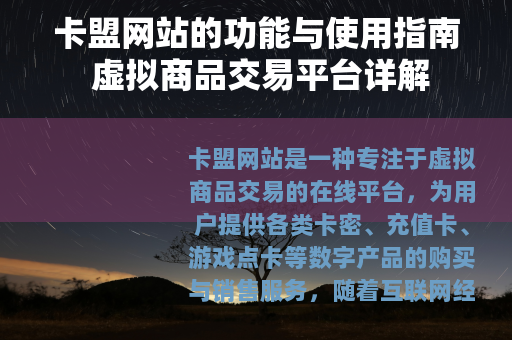 展望未来,卡盟网站可能会与更多行业结合,例如在线教育、娱乐订阅等,拓展服务领域,随着人工智能和大数据的应用,卡盟网站能够分析用户行为,提供更精准的商品推荐,优化用户体验,卡盟网站不仅是虚拟商品交易的重要平台,更是数字经济发展的重要组成部分,通过合理使用和持续创新,卡盟网站将继续为用户和商家创造价值,推动行业的健康前行。