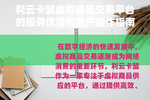 在数字经济的快速发展中,虚拟商品交易逐渐成为网络消费的重要环节,利云卡盟作为一家专注于虚拟商品供应的平台,通过提供高效、安全的服务,满足了广大用户对游戏点卡、软件授权、会员服务等数字产品的需求,本文旨在全面介绍利云卡盟的平台特点、服务优势以及用户操作流程,为读者提供一个清晰的参考。