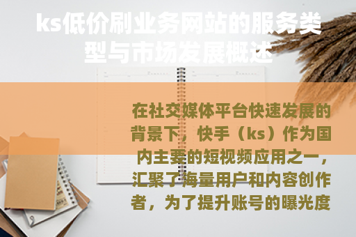 在社交媒体平台快速发展的背景下,快手(ks)作为国内主要的短视频应用之一,汇聚了海量用户和内容创作者,为了提升账号的曝光度与互动数据,部分创作者会借助外部服务进行辅助推广,ks低价刷业务网站逐渐成为一种常见选择,这类网站以较低的价格提供粉丝增长、点赞提升、评论互动等数据服务,本文将从服务项目、价格特点、运作方式、用户反馈及行业现状等方面,对ks低价刷业务网站进行综合介绍。