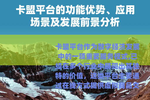 卡盟平台凭借其功能优势、广泛的应用场景和乐观的发展趋势,在现代商业中占据重要地位,它不仅为用户带来便捷和效率,还为服务提供商创造了新的机遇,随着技术的演进和市场的变化,卡盟平台将继续优化服务模式,推动数字生态系统的繁荣,对于个人和企业而言,合理利用卡盟平台的服务,将有助于在数字时代中获得更多便利与成长机会。