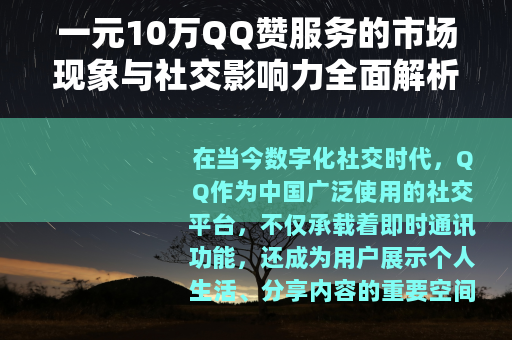 在当今数字化社交时代,QQ作为中国广泛使用的社交平台,不仅承载着即时通讯功能,还成为用户展示个人生活、分享内容的重要空间,随着社交媒体竞争的加剧,用户对互动数据如点赞数的关注度日益提升,一种名为“一元10万QQ赞”的服务应运而生,这项服务以极低的成本承诺提供大量点赞,迅速吸引了众多用户的兴趣,本文将从该服务的运作机制、用户需求背景、市场现状、实际效果及使用建议等方面进行详细探讨,以客观视角呈现这一社会现象。