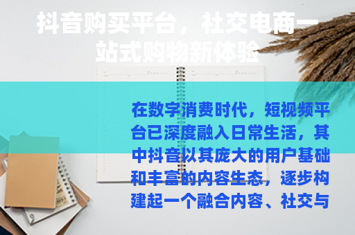 在数字消费时代,短视频平台已深度融入日常生活,其中抖音以其庞大的用户基础和丰富的内容生态,逐步构建起一个融合内容、社交与商业的综合性购买平台,这一平台不仅改变了传统电商的浏览模式,更重塑了用户从发现到决策的购物路径。