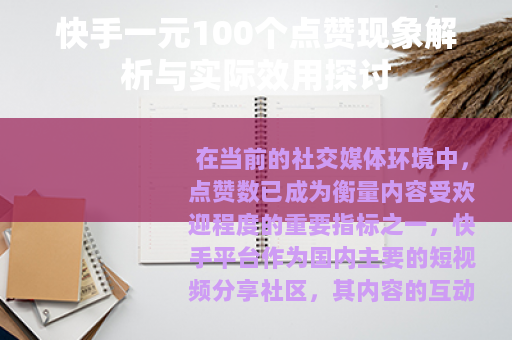 在当前的社交媒体环境中,点赞数已成为衡量内容受欢迎程度的重要指标之一,快手平台作为国内主要的短视频分享社区,其内容的互动数据,尤其是点赞量,往往影响着创作者的曝光率与受众关注度,近年来,网络上出现了诸如“一元100个点赞”这类服务信息,这引发了许多用户对于数据增长方式的关注,本文将围绕这一现象,从多个角度分析其背后的市场需求、实际效果以及对内容生态的潜在影响,并探讨更为健康、可持续的内容成长路径。