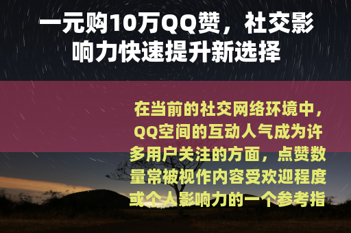 在当前的社交网络环境中,QQ空间的互动人气成为许多用户关注的方面,点赞数量常被视作内容受欢迎程度或个人影响力的一个参考指标,一些网络服务提供了便捷的提升互动数据途径,例如以较低成本获取大量点赞,一元10万QQ赞”便是较为典型的一种。