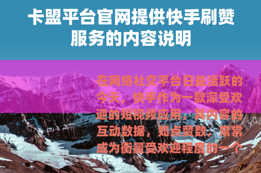 在网络社交平台日益活跃的今天,快手作为一款深受欢迎的短视频应用,其内容的互动数据,如点赞数,常常成为衡量受欢迎程度的一个参考指标,许多用户希望自己的作品能获得更多关注,一些提供相关服务的网络平台应运而生,卡盟平台官网便是用户经常接触到的、能够提供快手刷赞服务的一类网站。