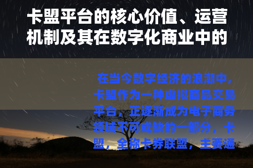 在当今数字经济的浪潮中,卡盟作为一种虚拟商品交易平台,正逐渐成为电子商务领域不可或缺的一部分,卡盟,全称卡券联盟,主要通过整合各类虚拟资源,如游戏点卡、软件授权码、会员充值服务及电子优惠券等,为商家和消费者搭建起一个高效、便捷的交易桥梁,本文将从卡盟的基本概念出发,探讨其运营模式、优势特点、实际应用以及未来发展趋势,以全面展现这一平台在现代商业环境中的重要作用。