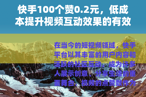 在当今的短视频领域,快手平台以其丰富的用户内容和活跃的社区互动,成为许多人展示创意、分享生活的重要舞台,视频的点赞数作为衡量受欢迎程度的关键指标,不仅反映了观众的兴趣,还能直接影响平台的推荐算法,帮助视频获得更多曝光机会,近年来,市场上出现了一种服务:以0.2元的价格获得100个点赞,这一现象引起了广泛关注,它为内容创作者提供了一种经济高效的方式来提升互动量,进而助力视频传播和成长。