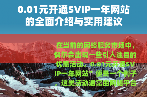 在当前的网络服务市场中,偶尔会出现一些引人注目的优惠活动,0.01元开通SVIP一年网站”便是一个例子,这类活动通常由网站平台推出,旨在以极低的门槛吸引用户体验其高级会员服务,对于用户而言,这无疑是一个节省开支、享受丰富权益的机会,本文将详细介绍这一优惠的相关信息,帮助读者了解其背景、内容及参与方式。