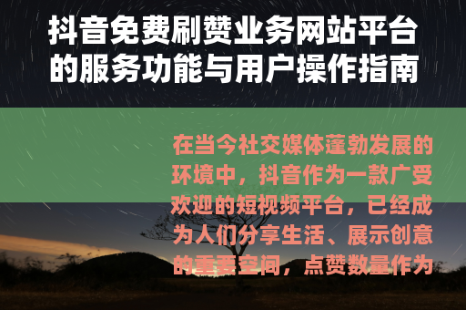 抖音免费刷赞业务网站平台通过在线任务机制,为用户提供了一种增加点赞的途径,用户可以通过了解服务流程和注意事项,有效利用这些资源来辅助内容推广,在社交媒体竞争中,此类平台作为工具之一,有助于用户提升互动数据,但结合自身创作和平台规范,才能实现长期发展,通过积极参与和合理操作,用户可以更好地享受抖音带来的社交乐趣。