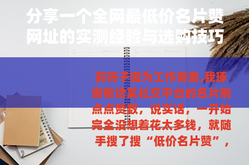 前阵子因为工作需要,我琢磨着给某社交平台的名片刷点点赞数,说实话,一开始完全没想着花太多钱,就随手搜了搜“低价名片赞”,结果跳出来一堆网址,个个都标着“全网最低价”,看得人眼花,后来折腾了大半个月,试了七八个平台,踩过坑也捡过漏,最后总算摸出点门道,今天闲着,就把这些经验零零散散写下来,说不定能帮到有类似需求的人。