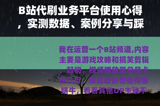 我在运营一个B站频道,内容主要是游戏攻略和搞笑剪辑,起初,视频播放量总是卡在几百,粉丝增长也慢得像蜗牛,看着其他UP主动不动就上万播放,我心里有点急,于是动了找代刷业务平台的心思,说实话,这行当在网上挺常见的,广告满天飞,都说能快速提升数据,但实际用起来怎么样?我花了两个月时间,试了好几个平台,攒了一堆数字、案例和教训,我就把这些经历零零散散地写下来,不搞什么标准结构,就聊聊我的所见所感,如果你也在琢磨这事儿,或许能帮你省点钱、少走点弯路。