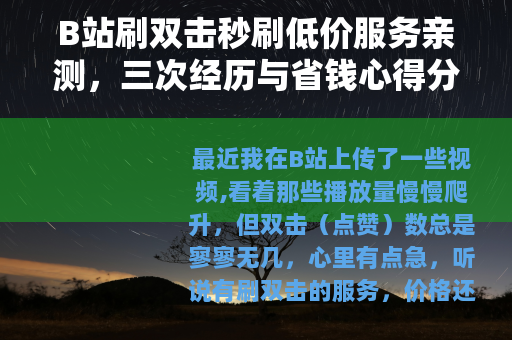 最近我在B站上传了一些视频,看着那些播放量慢慢爬升,但双击(点赞)数总是寥寥无几,心里有点急,听说有刷双击的服务,价格还挺便宜,我就想试试看,毕竟,互动数据高点,可能能让视频更显眼些,我花了点时间研究,亲自体验了几次,中间遇到了不少波折,也总结出一些实用的小技巧,今天就跟大家聊聊这段经历,希望能帮你省点钱和精力。