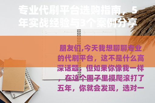 朋友们,今天我想聊聊专业的代刷平台,这不是什么高深话题,但如果你像我一样,在这个圈子里摸爬滚打了五年,你就会发现,选对一个平台能省下不少时间和金钱,而选错了,那简直就是一场噩梦,我在这五年里,用过超过二十个代刷平台,从刷社交媒体粉丝到电商销量,从游戏代练到数据优化,几乎都试了个遍,我就以一个普通用户的角度,分享一些数字、真实案例,还有我踩过的那些坑,文章可能会有点长,但我会尽量说得自然点,就像朋友间聊天一样,希望能给你带来点实用的东西。