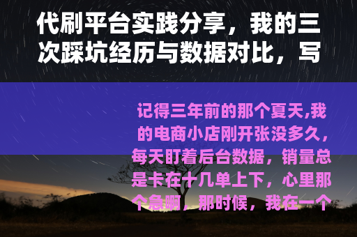 记得三年前的那个夏天,我的电商小店刚开张没多久,每天盯着后台数据,销量总是卡在十几单上下,心里那个急啊,那时候,我在一个卖家社群里潜水,看到有人提到“代刷平台”,说能快速把产品排名刷上去,甚至有人晒出截图,显示销量一夜之间涨了几百,我心动了,想着反正试试看,说不定能突破瓶颈,我开始了和代刷平台打交道的日子,这段经历里,有数字、有案例,也有不少让我摇头的踩坑故事,我就把这些都摊开来,用闲聊的方式说说,希望能给想尝试的人一点参考。
