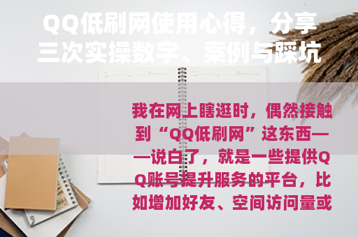 我在网上瞎逛时,偶然接触到“QQ低刷网”这东西——说白了,就是一些提供QQ账号提升服务的平台,比如增加好友、空间访问量或群成员,作为一个普通用户,我纯粹出于好奇想试试,结果折腾了好一阵子,花了点小钱,也积累了不少经验,我就用闲聊的方式,把这些数字、案例和踩坑经历摊开来聊聊,希望能给想尝试的朋友一点参考,文章不会讲大道理,就是实打实的个人记录,或许有点啰嗦,但保证都是干货。