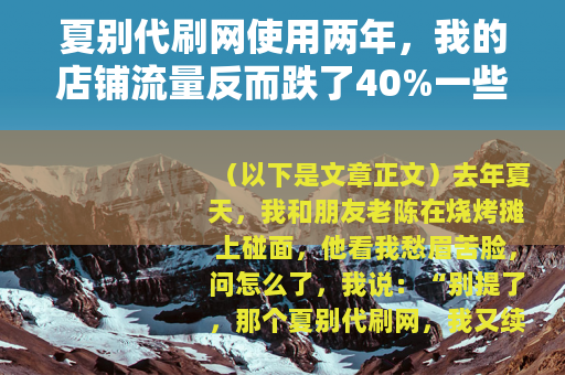 去年夏天,我和朋友老陈在烧烤摊上碰面,他看我愁眉苦脸,问怎么了,我说:“别提了,那个夏别代刷网,我又续费了半年,但上个月自然搜索访客比去年同期少了快一半。”他嘬了口啤酒:“巧了不是,我工作室三个店铺都用过它,后来全停了。”我俩这一对,发现踩的坑都差不多,今天不是来说教,就是聊聊真实发生的事,几个数字,几个具体的场景,也许你正在考虑,听完了你自己判断。