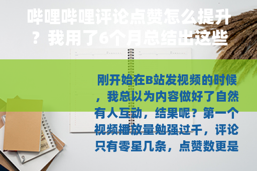 刚开始在B站发视频的时候,我总以为内容做好了自然有人互动,结果呢?第一个视频播放量勉强过千,评论只有零星几条,点赞数更是惨淡——不到50个,那时候我每天刷新页面,心里琢磨:到底哪儿出了问题?后来我花了差不多半年时间,折腾了十几个视频,才慢慢摸出点门道,今天就跟大伙儿随便聊聊,关于哔哩哔哩评论点赞的那些事儿,里面会掺点数字、几个实际案例,还有我亲自踩过的坑,希望你看完能觉得有用,而不是一堆空话。