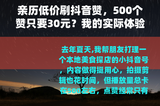 说实话,网上一搜“抖音赞”,铺天盖地的广告,其中一个弹窗广告我记得特别清楚:“真人高质量点赞,500赞仅需30元,速到!” 这价格低得有点让人心动——平均下来一个赞才6分钱,朋友说,街边找人帮点个赞,给瓶水都不止这个价,抱着“试试水”的心态,我们决定从这个30元的套餐开始。