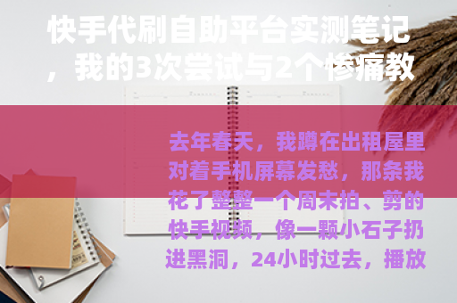 去年春天,我蹲在出租屋里对着手机屏幕发愁,那条我花了整整一个周末拍、剪的快手视频,像一颗小石子扔进黑洞,24小时过去,播放量387,点赞9个,其中还有4个是我自己和小号点的,那时候我的快手账号做了快半年,粉丝数卡在2210左右,不上不下,我是个普通用户,没团队,没预算投“粉条”,就是单纯想让自己做的东西被多几个人看见,鬼使神差地,我在搜索引擎里敲下了“快手代刷自助平台”这几个字,接下来的几个月,我像进入了一个光怪陆离的新世界,交了不少“学费”,也终于摸到了一点门道,这不是什么行业揭秘,就是一个普通用户的真实流水账。