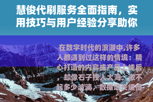 在数字时代的浪潮中,许多人都遇到过这样的情境:精心打造的内容或产品上线后,却像石子投入大海,激不起多少波澜,数据增长缓慢,粉丝互动寥寥,让人不禁感到焦虑,这时,一些工具或服务便进入了视野,慧俊代刷就是其中之一,我最初听说它,是在一个行业交流群里,有人提起用它提升了社交账号的活跃度,出于好奇,我尝试了一番,并在此分享一些直观的感受和思考,希望能为感兴趣的人提供参考。