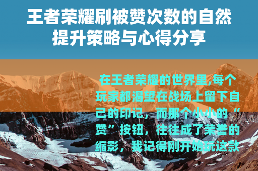 在王者荣耀的世界里,每个玩家都渴望在战场上留下自己的印记,而那个小小的“赞”按钮,往往成了荣誉的缩影,我记得刚开始玩这款游戏时,每次对局结束,看到队友或对手点来的赞,心里总会涌起一股暖流——那不是简单的数字,而是对一场合作或竞技的认可,随着时间的推移,我注意到不少玩家开始关注自己的被赞次数,甚至将其视为个人实力的象征,但如何让这个数字自然增长,而不陷入功利化的追逐?我想分享一些基于个人经验和玩家交流的心得,聚焦于正当、可持续的方式,来提升王者荣耀中的被赞次数。