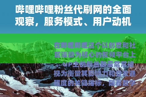 在哔哩哔哩这个以创意和社区驱动为核心的视频平台上,UP主的粉丝数量常常被视为衡量其影响力和受欢迎程度的关键指标,随着数字内容经济的蓬勃发展,粉丝不仅代表着个人品牌的认可,还直接关联到商业合作、广告收入以及社交资本的积累,对于许多创作者而言,从零开始积累粉丝是一个漫长且充满挑战的过程,需要持续的内容输出、精准的受众定位以及有效的互动策略,在这样的背景下,一些提供快速增粉服务的在线平台——通常被称作“哔哩哔哩粉丝代刷网”——逐渐涌现,它们承诺通过技术或人工手段,在短时间内提升UP主的粉丝数量,从而满足不同创作者的需求,这类服务的存在,反映了内容创作领域中的一种现实需求,也引发了关于粉丝经济、平台生态与创作者选择的广泛讨论,本文将从服务详情、市场动因、运作流程、用户反馈以及行业趋势等多个角度,深入探讨哔哩哔哩粉丝代刷网的相关现象,旨在提供一个全面而中立的视角。