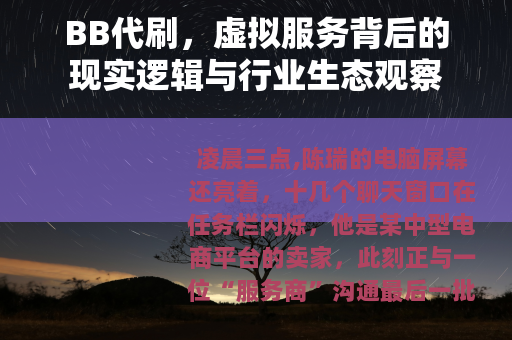 凌晨三点,陈瑞的电脑屏幕还亮着,十几个聊天窗口在任务栏闪烁,他是某中型电商平台的卖家,此刻正与一位“服务商”沟通最后一批订单的交付数据,他需要的不是实物商品,而是一种叫做“BB代刷”的服务——为他店铺的某个新上架产品,在短时间内增加特定的关注、互动或交易记录,这不是他第一次使用这类服务,用他的话说,“这就像给产品打个底,让它看起来不那么‘生’。”