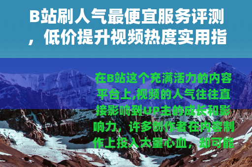 在B站这个充满活力的内容平台上,视频的人气往往直接影响到UP主的成长和影响力,许多创作者在内容制作上投入大量心血,却可能因为初始曝光不足而难以突破瓶颈,这时,一些人会考虑通过外部服务来快速提升人气,而市场上确实存在价格相对较低的选择,我就以个人经验和市场观察为基础,聊聊如何找到那些性价比高的B站刷人气服务,并分享一些实用见解。