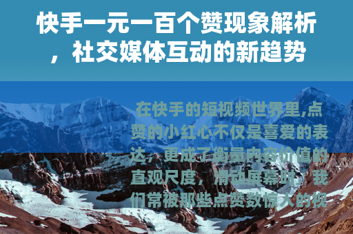 在快手的世界里,每一秒都有无数视频上传,每一刻都有点赞产生。“一元一百个赞”只是浩瀚数据流中的一滴水,但它激起的涟漪,让我们看到社交媒体互动的复杂面貌,无论你作为用户还是观察者,理解这一现象,都能帮助你在数字生活中找到更平衡的路径,毕竟,在虚拟的点赞背后,真实的生活和创作才是永恒的核心。