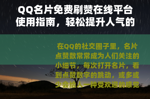 QQ名片免费刷赞在线平台是社交工具中的一种,它回应了用户对即时反馈的需求,通过明智选择和适度使用,可以在不干扰正常社交的情况下,为名片增添亮点,点赞数字只是社交的一小部分,真实的情感交流和共享时刻才是核心,在数字世界中,找到平衡点,既能享受技术带来的便利,也不失人际温暖的本质,这才是可持续的社交之道,希望每位用户都能以轻松心态,探索更多提升社交体验的方式。