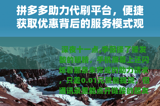 深夜十一点,李薇揉了揉发酸的眼睛,手机屏幕上还闪烁着那条未完成的助力请求,只差0.01元就能提现,但通讯录里能点开链接的朋友似乎早已耗尽,她叹了口气,在搜索引擎框里输入了几个字,几分钟后,她在一个界面简洁的网站上支付了小额费用,次日清晨,任务进度条已悄然满格,这背后,是一个悄然生长、与拼多多助力活动相伴而生的服务领域——助力代刷平台。