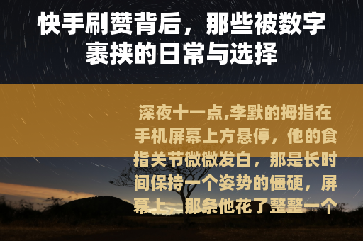 深夜十一点,李默的拇指在手机屏幕上方悬停,他的食指关节微微发白,那是长时间保持一个姿势的僵硬,屏幕上,那条他花了整整一个周末拍摄、剪辑的短视频,播放量像卡住的钟摆,停在三千七百这个数字上,而右下角那个红色的心形符号旁边的数字,是二百四十三,他脑子里盘旋着一个从朋友那里听来的、模模糊糊的网址,据说只需要一点费用,就能让那个数字“好看”起来,房间里只有手机屏幕的光,映着他有些疲惫的脸,这或许是我们时代里,无数个相似夜晚中的一个普通切片。