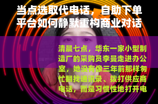 清晨七点,华东一家小型制造厂的采购员李曼走进办公室,她没有像三年前那样匆忙翻找通讯录、拨打供应商电话,而是习惯性地打开电脑浏览器,登录一个熟悉的界面,几分钟内,本周所需的五金配件、包装材料已核对库存、完成比价并提交订单,数百公里外,一家文创工作室的主理人通过手机,为一款新产品的打样服务完成了在线预约与支付,这些安静、零散的点击动作,正汇聚成一股深刻的变革力量——自助下单平台,这种不再依赖传统业务员、电话传真或反复邮件确认的交易界面,正在以其特有的冷静与效率,重新编织商业世界的基本连接方式。